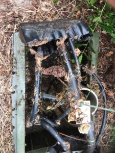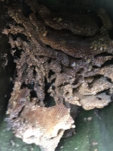 Underground electric pedestals transfer power from lines of service and distribute the energy to customers. These units are marked “hazardous”. Only authorized, trained professionals are permitted to service such devices. When a colony of bees presents itself into a pedestal, energy providers, such as Duke and F P L, should be notified. After the pedestal has been de-energized, the cover can be removed to expose the bee colony and its honeycombs. The bees can then be removed and relocated.